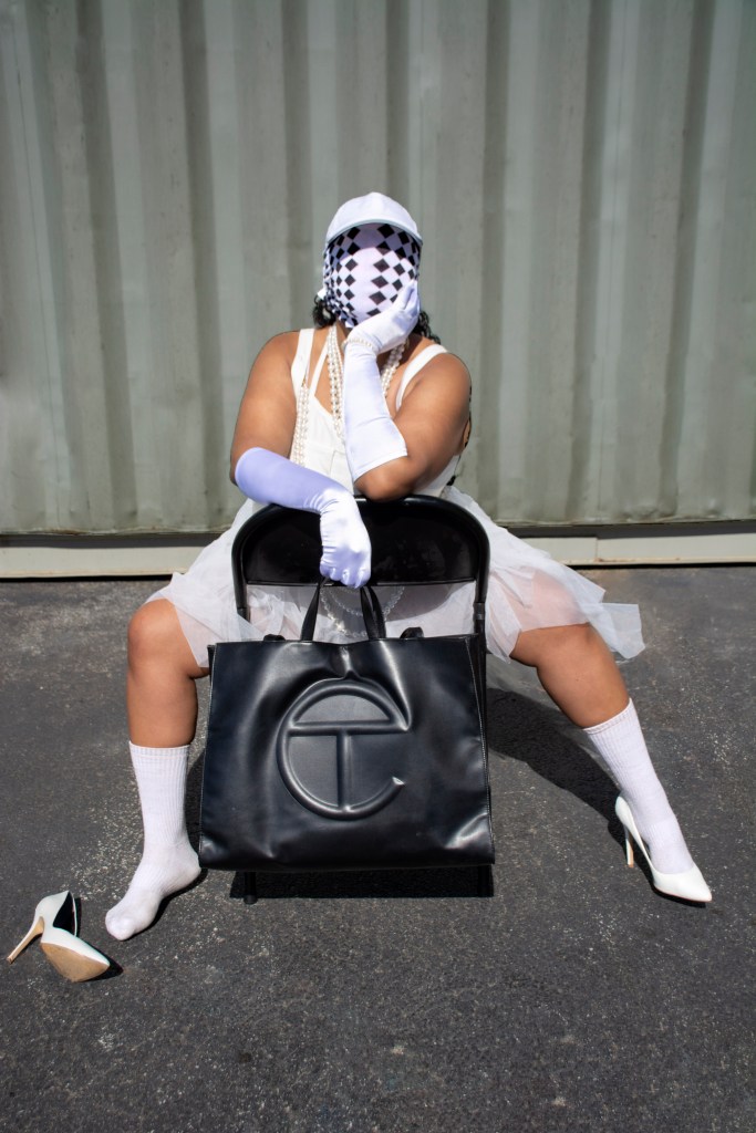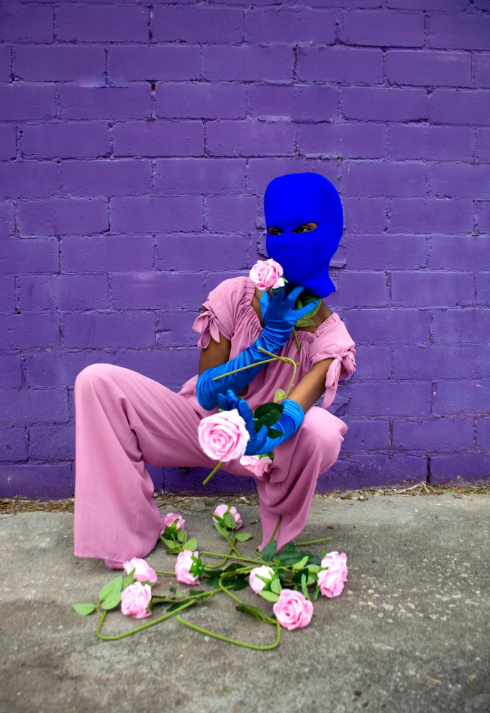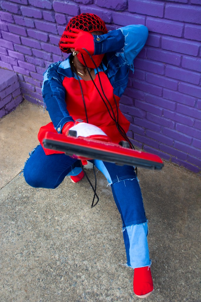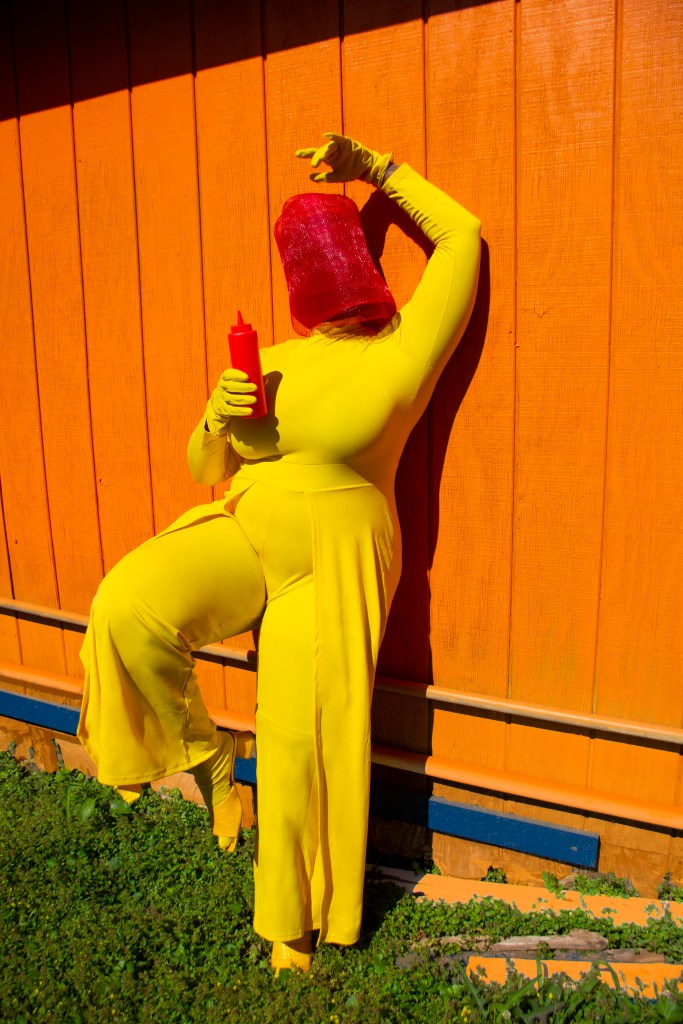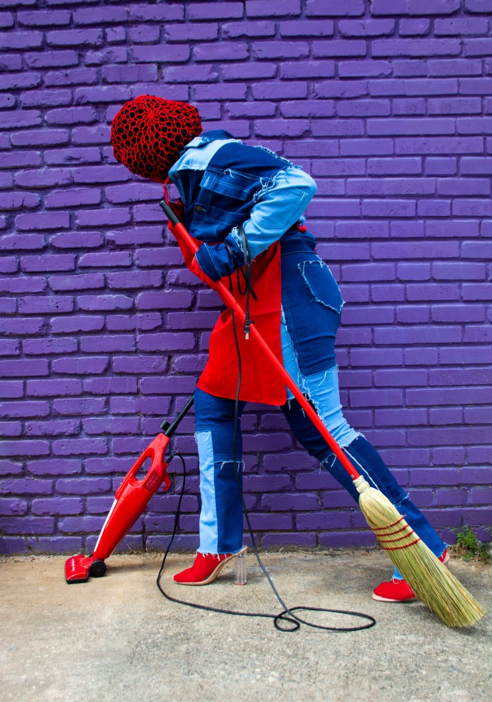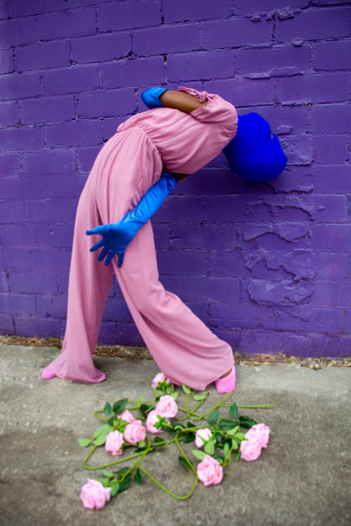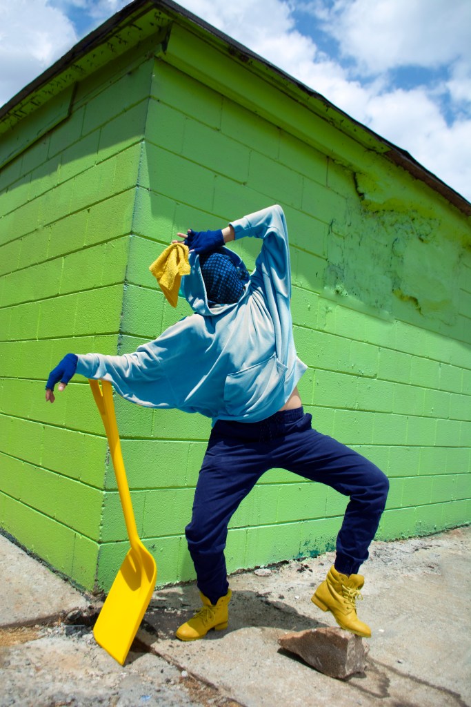 The “Stacking” photo series consists of characters that are all disguised while portraying a narrative with gender and nongender roles. In addition, each character of this series is attached to a color equation. (ex: white + black = gray, yellow + blue = green, pink + blue = purple, and yellow + red = orange)